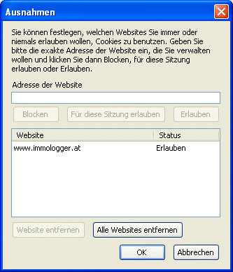 Sie finden beim Firefox in der Menüzeile den Eintrag "Extras" (ganz rechts). Diesen anklicken und jetzt "Cookies" auswählen. In dem nun geöffneten gelben Bereich finden Sie einen Knopf "Ausnahmen". Es öffnet sich ein Fenster. Fügen Sie bitte den Eintrag "www.immologger.at" hinzu. Mit "Erlauben" übernehmen und mit "OK" das Fenster wieder schließen. FERTIG! |
