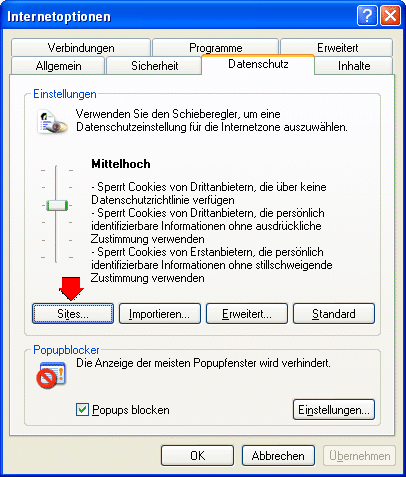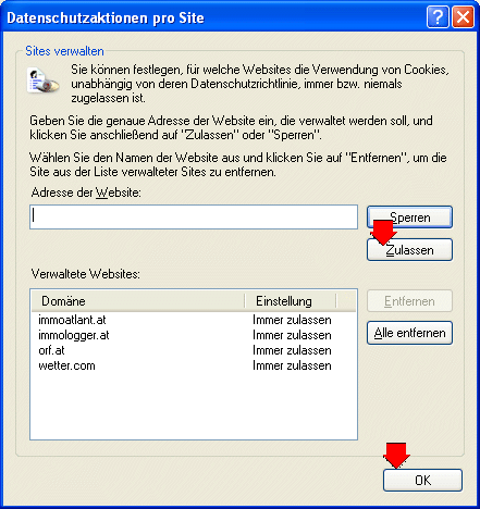 Sie finden beim Internetexplorer in der Menüzeile den Eintrag "Extras"(ganz rechts). Diesen anklicken und jetzt "Internetopionen..." (unten) auswählen. Es öffnet sich ein Fenster. Suchen Sie jetzt den Karteireiter ! (oben) mit der Bezeichnung "Datenschutz". Diesen anklicken. Im neuen Fenster klicken Sie jetzt auf "Sites...". In diesem, nunmehr letzten Fenster, fügen Sie bitte den Eintrag "immologger.at" hinzu. Mit "zulassen" übernehmen und mit "OK" das Fenster wieder schließen. FERTIG !