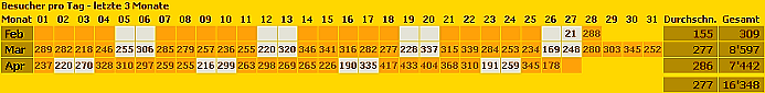 Die obere Grafik zeigt Ihnen die Anzahl der Besucher, die untere die Summe von Objektaufrufen. Zur einfacheren Analyse sind die Wochenenden extra farblich markiert. |